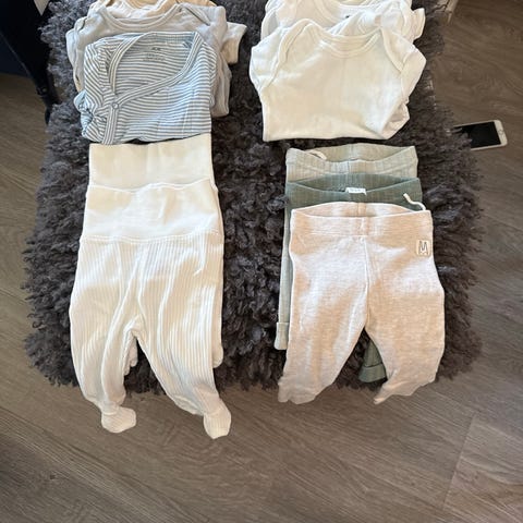 Selger en klespakke med lite brukt/ubrukte plagg. 3 omslagsbodyer med 3 tilhørende bukser med ben og 1 omslagstskjorte fra H&M. 1 genser og 1 bukse fra name it.