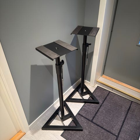 Selger ett par høyttaller stativ H 58 cm. Merke B Tech. De er helt i orden. Selges samlet for 450,- Topplaten er ca 16,5 x 16,5 cm