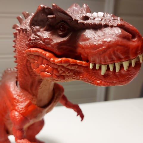 Liten gutt som er ferdig med dinosaurfasen selger lekene sine.