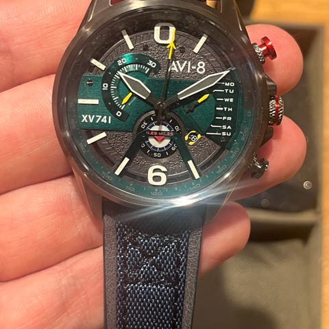 Klokken har sandwich-skive med Super-LumiNova®, rød kronografsekundviser og praktisk dag-dato-visning. På baksiden sitter en gravert medaljong av et F-14 Tomcat jagerfly – en kul detalj for entusiaster.