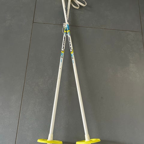 Swix skistaver med lengde 90 cm, i blå og hvit farge. Skistavene har håndtak med stropp og plast tupp.