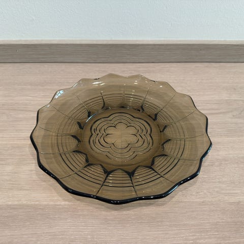 Nydelig stettfat i pressglass. Bølget kant på flatt fat. Dekorativt mønster.