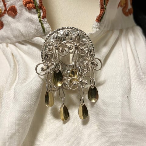 En vakker liten sølje i hvitt sølv som pynter opp bunaden til en liten jente.