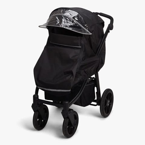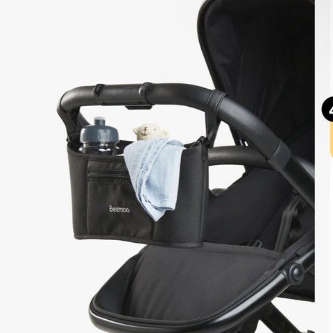 Barnevognorganiser fra Yngri i svart med koppholder og 2 oppbevaringslommer. Designet for å festes på håndtaket til barnevognen, gir enkel tilgang til drikke og småting under turer. I hovedsak til dobbel barnevogn og tvillingvogn.