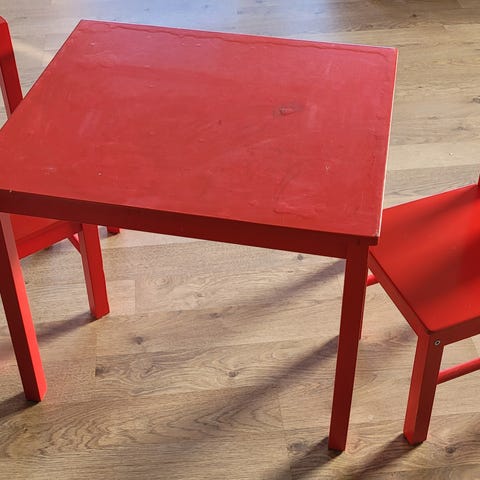 Håndmalt barnestol med karius og baktus motiv, og skrift hvor det står Magnus.