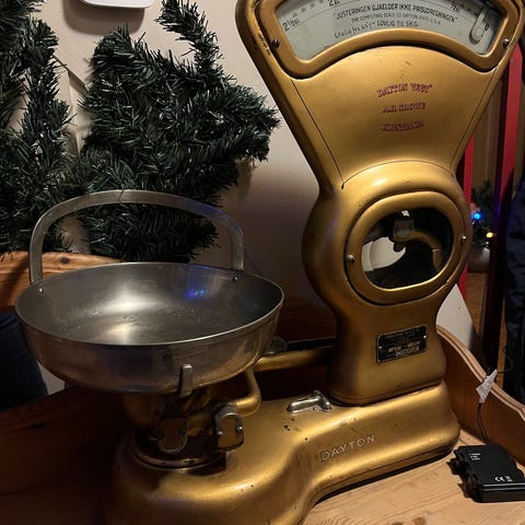 Kjøkkenvekt i rød og hvit farge med mekanisk skala. Passer til veiing av matvarer og andre kjøkkenrelaterte oppgaver.