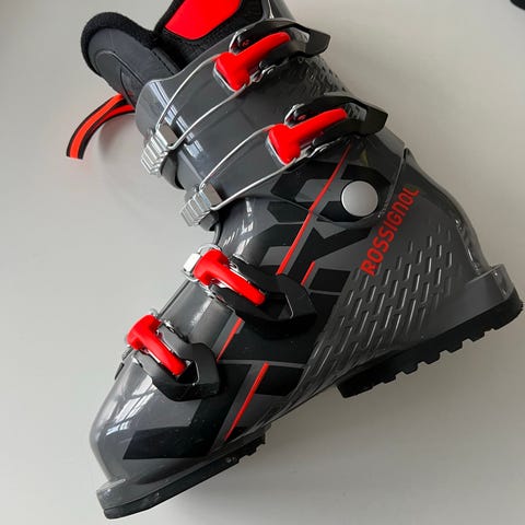 Rossignol Hero Jr alpinstøvel i størrelse 235. Støvelen har grå farge med røde detaljer og fire spenner for god justering. Passer for barn og junior. Materialet er plast med polstret innersko for komfort.