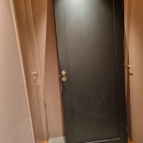 Døra var i bruk i 1 mnd før vi tok den av hengslene, og den har stått lagret i kjelleren i 5 år siden. Har innsett at den ikke vil bli tatt i bruk og håper den ka få et bytt hjem.