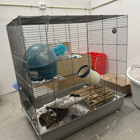 Gigantisk pakke med hjemmesnekret bur, reisebur, bunnstrø, sand, to løpehjul og masse aktivitetsleker slik at innholdet i buret kan endres.
