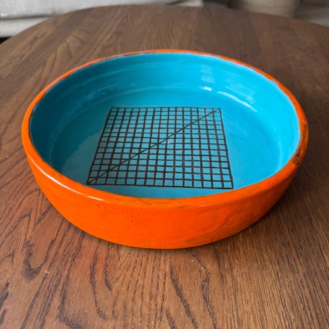 Selger en flott stor bolle i keramikk som kan brukes både som serveringsbolle, fruktfat el.l. Det er bare fantasien som setter grenser. Den er også nydelig bare som dekorasjon i hjemmet. Tåler oppvaskmaskinen.