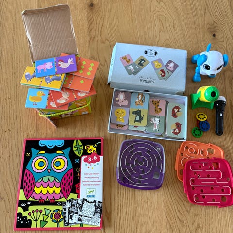 Lite brukt. De blå brikkene har ulike mønstre på hver side. På noen av de blå brikkene er det tegnemerker og på andre er det noen skader etter at tegnemerker er forsøkt tørket av. Se bilder