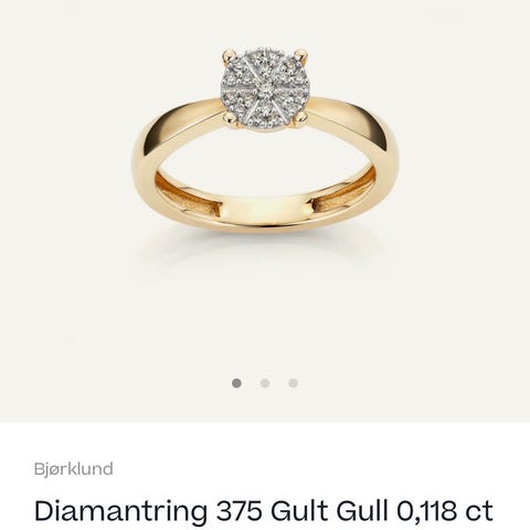 Nydelig ring i 14 karat gult gull med ekte diamanter, kjøpt hos Gullfunn/Kristiansand for noen år siden. Dette er en klassisk og feminin ring med et elegant diamantcluster.