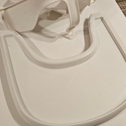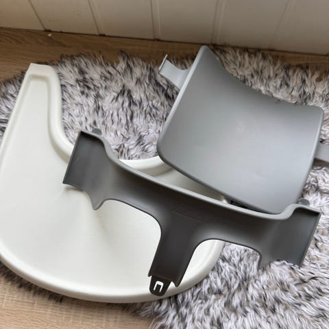 Tilbehør til stokkestol: bøyle, ryggstøtte og spisebrett.