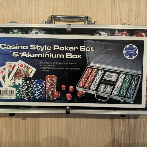 X-Sports Pokersett inkluderer pokerchips i flere farger og to kortstokker. Settet leveres i en bærbar koffert som gjør det enkelt å oppbevare og transportere.