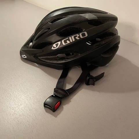 Giro sykkelhjelm i svart og rød farge. Hjelmen har flere ventilasjonsåpninger for lufting og justerbar stropp for tilpasning. Egnet for sykling og gir beskyttelse til hodet under aktivitet.