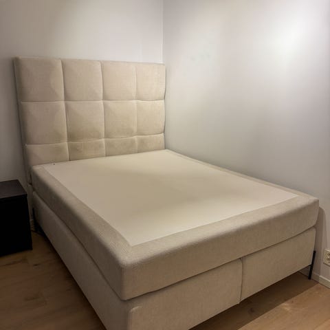 Preston kontinentalseng, kjøpt i oktober 2020. Madrassen er todelt, med avtagbart trekk. Hver madrass har en medium og en fast side, så det er mulig å kombinere medium og fast, om ønskelig.