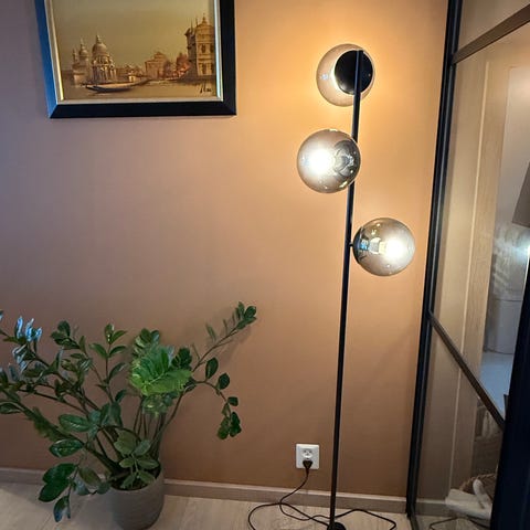Den er i fargen gull/messing og har fire glasskupler. Regulerbar ledning og deksel i metall. Passer til lyspærer med E27-sokkel. Alt fungerer som det skal.