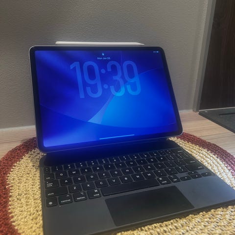 Denne gir masse lagringsplass, og kraftig prosessor som gir veldig god ytelse uten tegn til treghet. Den støtter både Apple Pencil 2. gen, Smart Keyboard, samt eksterne lydkort m.m. via USB-C-porten. Dette er 5G-versjonen hvor du ikke trenger å være påkoblet Wifi. Lader og Logitech Slim Folio Pro følger med. Slim Folio lades via USB-C, og har også lomme til Apple Pencil 2. gen.