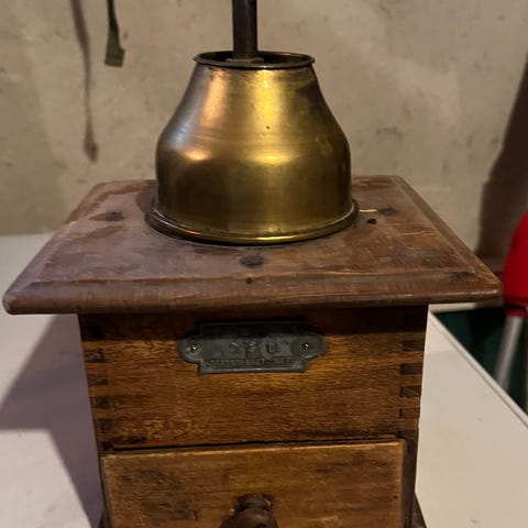 Kaffekvern laget av tre med metallkvern på toppen. Har en liten skuff under for å samle malt kaffe. Rustikk design med synlige bruksspor.