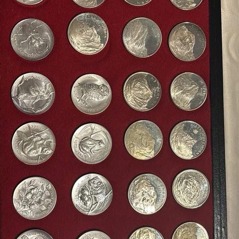 Ellis Island 1986 sølvmynt med motiv av Frihetsgudinnen og teksten 'Gateway to America'. Mynten har også inskripsjoner som 'Liberty', 'In God We Trust' og 'United States of America'. Verdien er 1 dollar.