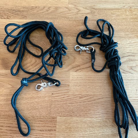 Hagebånd/line og krok fra trixie. Ubrukt, men lapp tatt av båndet.