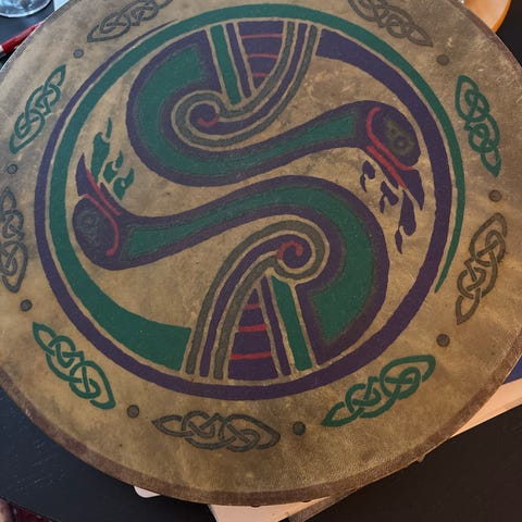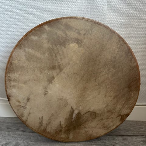 Vakker håndholdt sjamantrumme laget av kuhud og svart håndmalt motiv i stil med dansende figurer rundt en spiral.Perfekt for meditasjon, yoga, trommereiser, seremonier eller som stemningsfull innredningsdetalj.Trumman er ca. 40 cm i diameter og har et solid kryssformet håndtak på baksiden med snøring rundt rammen, noe som gjør den behagelig å holde selv over lengre tid.Gir en dyp, vibrerende lyd.Medfølger en passende klubbe med tre-skaft og myk, mørk slagdel som gir en varm, myk lyd.Passer deg som ønsker et enkelt og prisgunstig instrument for avslapning, lydheling, trommesirkler, seremonier eller deg som vil dekorere hjemmet med et spirituelt musikkinstrument.Sendes godt emballert eller hentes etter avtale.
