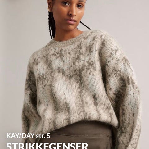 Myk genser i ullblanding med mønster fra Kay/Day Kappahl. Løstsittende modell med litt lengre rygg og ribbet rund hals. Litt utvidet erme med ribbestrikkede mansjetter. Str. S. Beige i fargen.