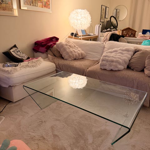 Pent brukt salongbord med praktiske oppbevaringsrom og hevbare seksjoner for eks måltider forran TV-en.