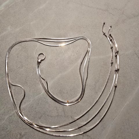 Selger mitt sølvfargede armbånd. Veldig pent og ser bra ut på hånden. Det er en liten defekt, men den er nesten ikke synlig og plager ikke. Vist på bildet 4-5.
