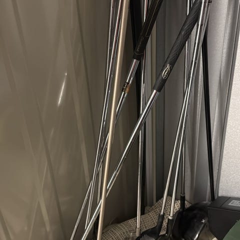 Diverse golfkøller med svarte grep og metallskaft. Drivere, putter og jernkøller, egnet for generell bruk i golfspill.