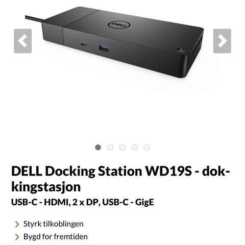 Dell WD19S dockingstasjon med USB-C tilkobling. Utstyrt med HDMI, to DisplayPort (DP), USB-C, flere USB-porter og Gigabit Ethernet (GigE). Designet for å utvide tilkoblingsmuligheter til bærbare datamaskiner med USB-C, egnet for kontor- og arbeidsmiljøer.