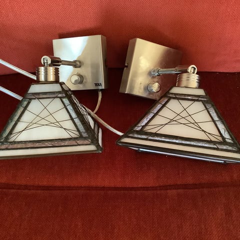 Bordlampe i kitsch Art Nouveau Tiffany-stil, med blåklokkeformet glassskjermer og en metall-fot med bronse-finish. Gir rommet et behagelig lys med sine grønne og oransje farger.