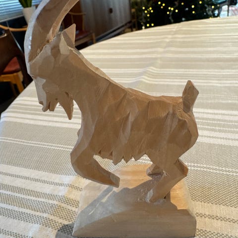 Dette er en geiteskulptur laget av tre.