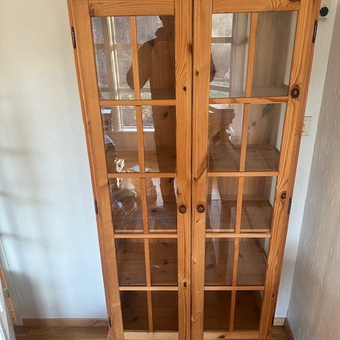 Skap selges uten innholdet på bildet. Glass hylleplater. Kan dele opp de to enhetene for lettere frakt