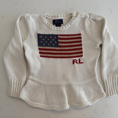 Selger en lite og pent brukt Polo Ralph Lauren "The Iconic Flag Sweater"-strikkeganser til barn i størrelse 110 (ca. 5 år). "The Iconic Flag Sweater" er en marineblå strikkegenser med høy hals med glidelås og et intarsia-motiv av det amerikanske flagget som hyller merkets arv. Laget av bomull for myk og behagelig bruk hele året. Genseren er i god stand.