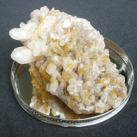 Unik og dekorativ kvartsklynge funnet i Vestfossen i Oslofeltet. Stykket består hovedsakelig av kvarts, med synlige innslag av ametyst og gulbrune jernmineraler, trolig limonitt som gir steinen et spennende og naturlig fargespill.