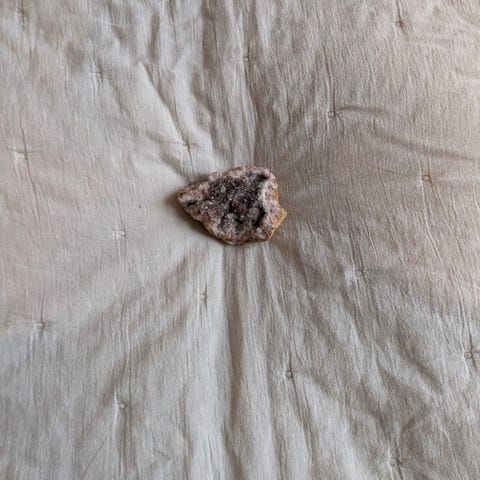 Krystallene sitter tett og delvis overgrodd, noe som gir et rått, naturlig uttrykk fremfor “perfekte” enkeltkrystaller. Overflaten er grundig renset i syrebad over flere døgn, men noe av jernmineraliseringen sitter svært godt og fremstår som naturlig krystallisert, dette bidrar etter min mening til karakter og dybde i stykket.