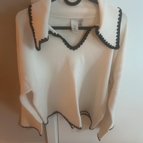 YAS Genser i størrelse M, svart farge, laget av bomull. Genseren har lange ermer og dekorative volanger på brystet og skuldrene. Egnet for kvinner. Brukt en gang.