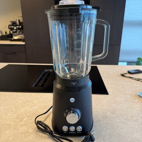 Wilfa DML-1200 blender med glasskanne og sort base. Blenderen har en kapasitet på 1,5 liter og en effekt på 1200 watt. Den er utstyrt med flere hastighetsinnstillinger og pulsfunksjon, egnet for miksing av ulike ingredienser i hjemmet.
