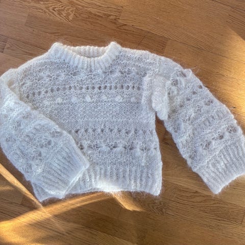 Selger denne lekre strikkegenseren i deilig pusete og fluffy mohair ull. Design av Lindtein og mønster Bris. Mønskeret har bobler, er luftig og pent med strikkede blomster og løkker. Genseren er varm og sitter pent på. Ermene er litt videre nede ved håndleddet og kortere ved magen slik at det passer fint til å ha nedi buksen forran eller til highwaist bukser dersom ønskelig.
