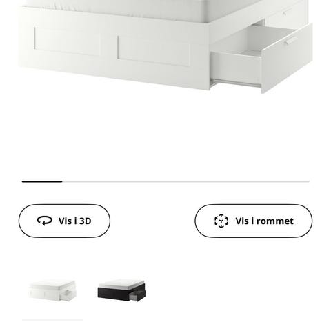 IKEA seng med skuffer i hvit tre. Sengemål er 160 cm bredde og 200 cm lengde. Tre skuffer under sengen med innvendige mål på 55 cm bredde og 70 cm dybde. Madrassmål er 80x200 cm. Sengen har en solid ramme og passer til standard madrassstørrelse. Designet for å gi ekstra oppbevaringsplass under sengen.