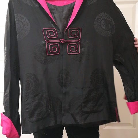 Kjøpt i Camden for mange år siden. Har alltid trodd det var silke, men oversettelse av lappen sier Nylon og Viskose, med for i polyester. Er merket med XL, men det er nærmere L. Tynne puter i skuldrene. Trekvart ermer. Flere steder fra der mønstrede stoffer er små tråder dratt ut, så man burde ta en runde med synål og flytte disse til baksiden. (Se bilder for eksempel.) Krøllete etter å ha ligget nedpakket lenge.