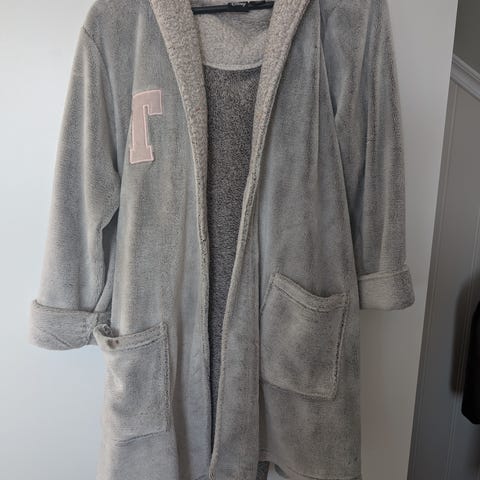 Veldig bløt og deilig morgenkåpe med sølvstjerne detaljer på armene. Str 36/38. 2 utvendig lommer og snøring. Merkelappen er tatt vekk men den har aldri vært brukt. Bare prøvd. Gave-for liten for meg. Rekker til midten av leggen.