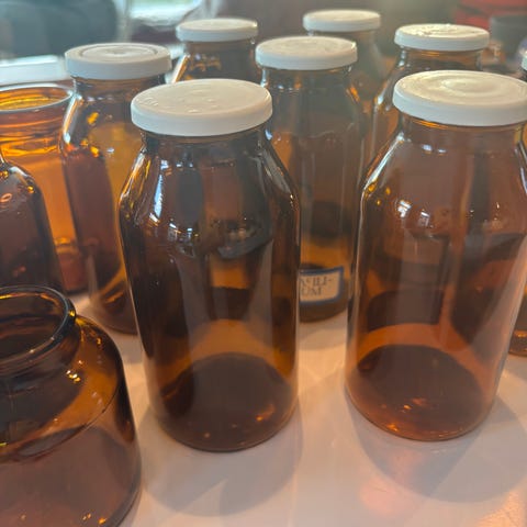 Synlige bruksmerker fra meieriet på den ene flasken.