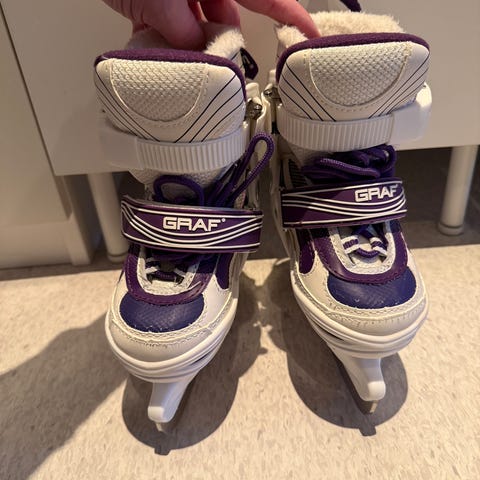 Skøytene har justerbar størrelse fra 27 til 30. Fargekombinasjon i hvitt og lilla.