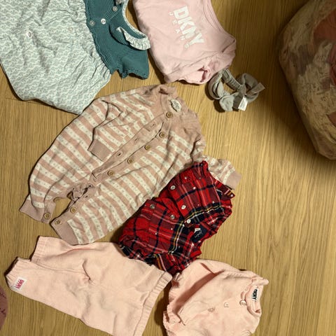 Jakker, pysjamaser, kjoler, bukser, gensere, leketeppe.