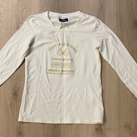 Hvit- og blåstripete genser fra Jean Paul. Klassisk seilerutseende. Genseren er myk og god å ha på seg. Stoffemblem på venstre arm. Genseren har et lite hull i siden som enkelt kan sys igjen hvis man ønsker det. Kan hentes (evt prøves) på Gullhella i Asker eller sendes mot porto.
