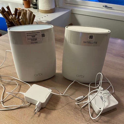 Netgear Orbi Router med dekning på 125 m² og frekvens på 2.2 GHz. Designet for å gi bedre Wi-Fi overalt i hjemmet eller kontoret. Stått ubrukt på kontoret hjemme da jeg har brukt et annet system.