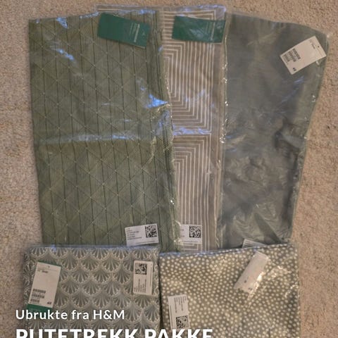 Pakke med 6 putetrekk fra H&M og IKEA. 50x50cm. Ubrukt og lite brukte. Kan hende at det er et lite merke på en av de, men ikke noe jeg har funnet når jeg har sett over.