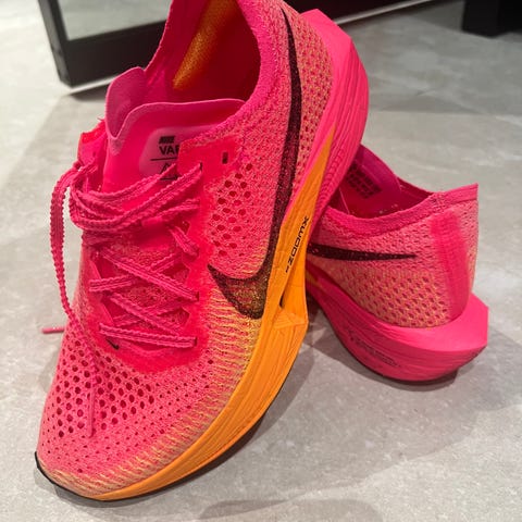 Nike Vaporfly løpesko i størrelse 38, rosa farge. Skoene er designet for løping og har en lett og pustende konstruksjon. Kun brukt 2 ganger